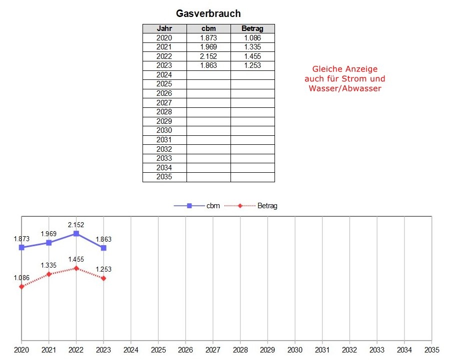Mithilfe dieser Vorlage kann eine Übersicht über den jährlichen Gas-, Strom- und Wasser-/Abwasserverbrauch erstellt werden.