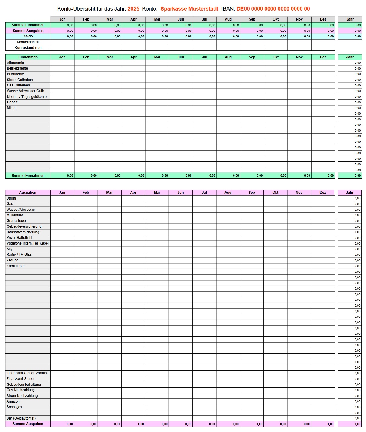 Mithilfe dieser Vorlage lässt sich eine Jahresübersicht für ein Bankkonto erstellen.