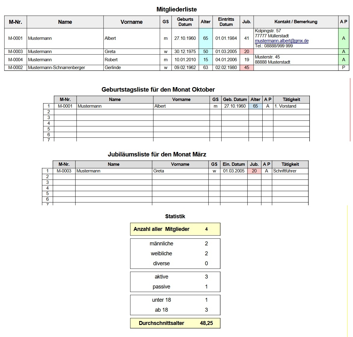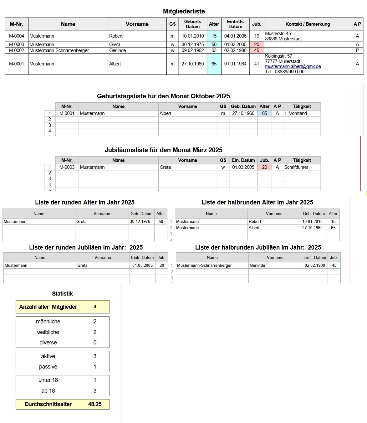 Mithilfe dieser Vorlage können Vereine, Clubs etc. ihre Mitglieder erfassen. Das Alter der Mitglieder sowie die Dauer ihrer Mitgliedschaft (Jubiläum) werden angezeigt. Außerdem können die Daten in Monatsblättern ausgewählt werden.
