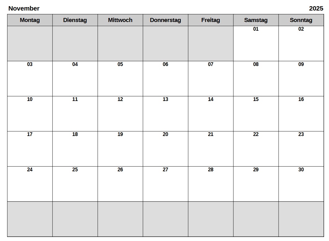 Mithilfe dieser Vorlage können Monatsblätter erstellt werden, die sich zum Ausdrucken und zum handschriftlichen Eintragen von Terminen eignen.