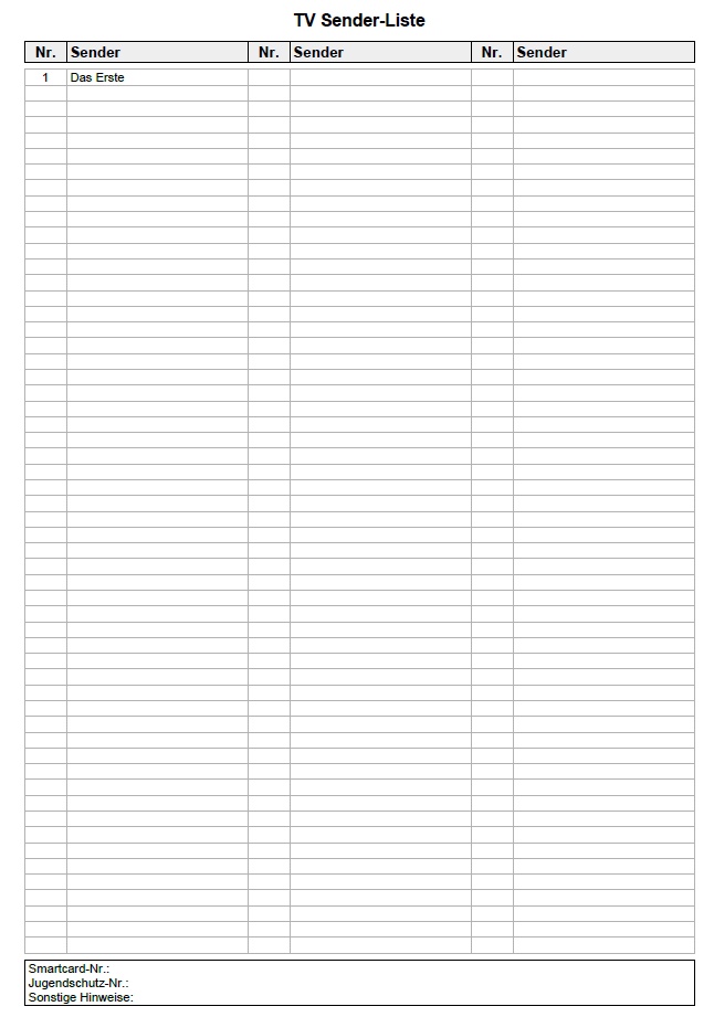 Mithilfe dieser Vorlage können Sie eine Liste Ihrer Fernsehsender erstellen. Tragen Sie dazu einfach die Programmplätze und die jeweiligen Sender ein und drucken Sie anschließend eine übersichtliche Liste aus.